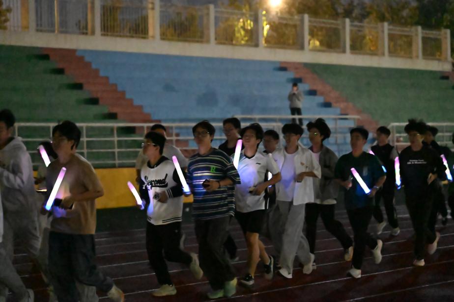活动第一阶段在学生会体育部的统筹组织下有条不紊地推进。同学们沿着操场跑道完成两圈集体跑步,夜色之中,闪烁的荧光与奔跑的身影相互映衬,不仅生动展现出高分子学子良好的精神风貌与过硬的身体素质,更让大家在集体奔跑的过程中深刻体会到:面对成长路上如黑夜般的挑战与荆棘,身边始终有并肩前行的伙伴,共同传递着青春的力量。